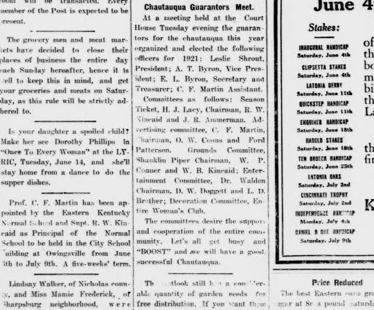 Last week’s excerpt was about the Chautauquas that came to Owingsville, and this week we follow up on that.